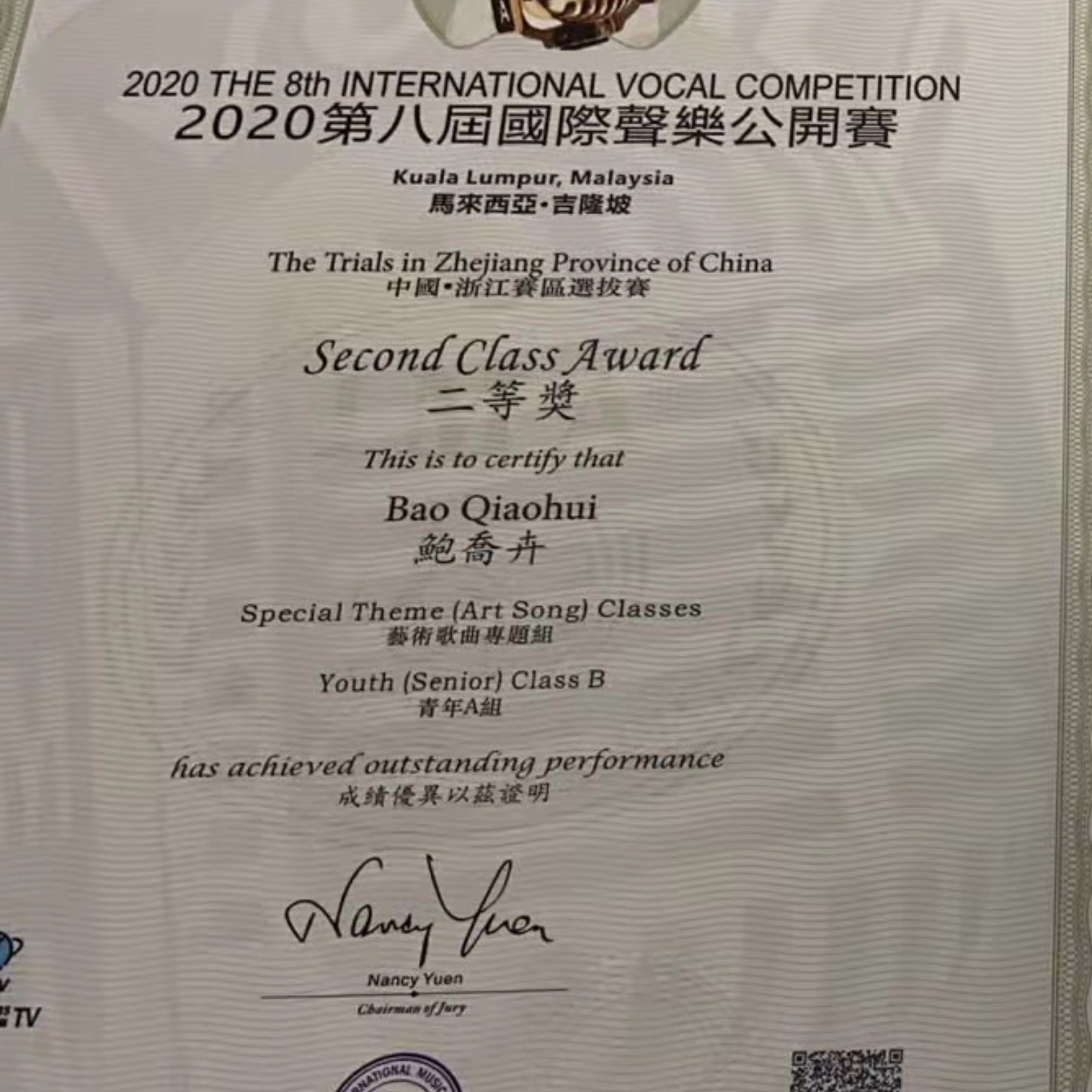 2020第八届国际声乐公开赛 二等奖