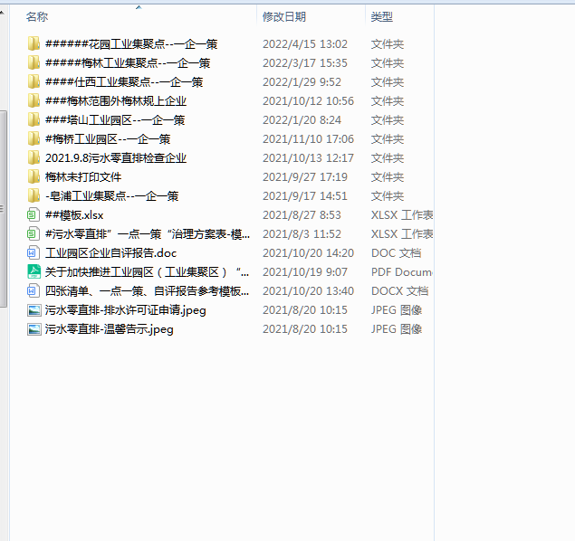 现场网格化监管指导落实(重点落实重点企业9家每两月一次、一般企业32家每三月一次)及其他企业1100余家每年一次环保排查监管;街道辖区摸底调查、中央省级信访件12家、县级信访件39家、媒体件2家环境安全风险隐患排查;年度信访件、中央环保督查件回访落实上报工作;环境风险源、污染源排查诊断(偷排漏排、固废危废),排查且帮助企业解决影响区域环境质量提升等方面的问题;企业“污水零直排”建设排查指导、“一点一策”治理方案表编辑落实(21年完成100余家、22年完成40余家、60余家待完成)等(本年度重点为花园工业园区80家、科技园区包括塔山工业园区80家)(期间设立污水零直排群4个)、企业整改自评报告编辑40余家;年度生态环保自评分台账落实上报;官方文件需要提交的报表上报;污水零直排系统入录59家;“无废城市”建设小危企业收运体系完成89家以上、一般工业固废收运体系完成430家以上(期间设立“无废城市”建设群1个、危废群1个、固废培训群1个);21年生态环境问题“举一反三”大排查大整改自行发现汇总64家,成功整改销号64家;年度“三同时”季报;全市低挥发性有机物原辅材料源头替代清单10家;年度强制性清洁生产审核企业拍排摸40家;“七张问题清单”上报2个;木制家具整治改造9家;塑料造粒及废塑料加工行业排查7家;工业固废铝灰、渣产生企业专项排查13家(期间设立铝灰、渣产生企业整改群1个),梅林街道发展服务科临时安排的其他环保相关工作(例:乡镇街道季度性安全环保大排查,协同应急管理所联动排查特定企业,查究告知问题、拟定整改周期并落实后期问题点整改情况等)